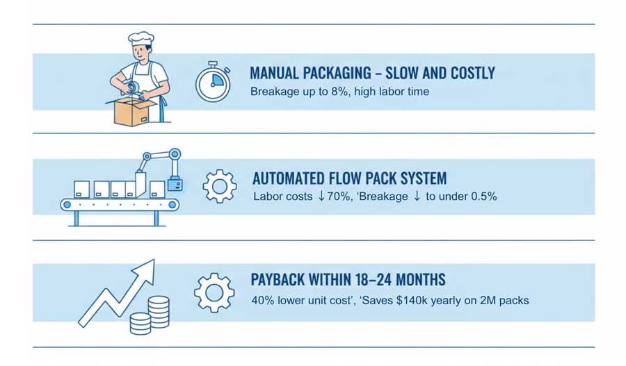 Flow pack wrappers reduce labor costs by 70% while cutting breakage from 8% to under 0.5%. The payback period runs 18 to 24 months for well designed systems.
