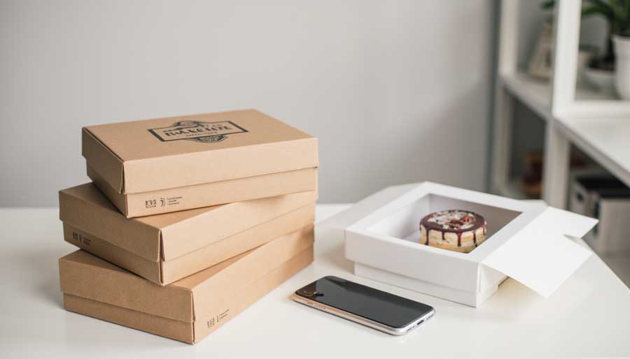 Windowed boxes combine clear product visibility with structural integrity. The plastic window lets customers verify order accuracy while kraft or corrugated exteriors provide crushing protection. Best for high value items like decorated cakes where visual confirmation builds trust before opening.