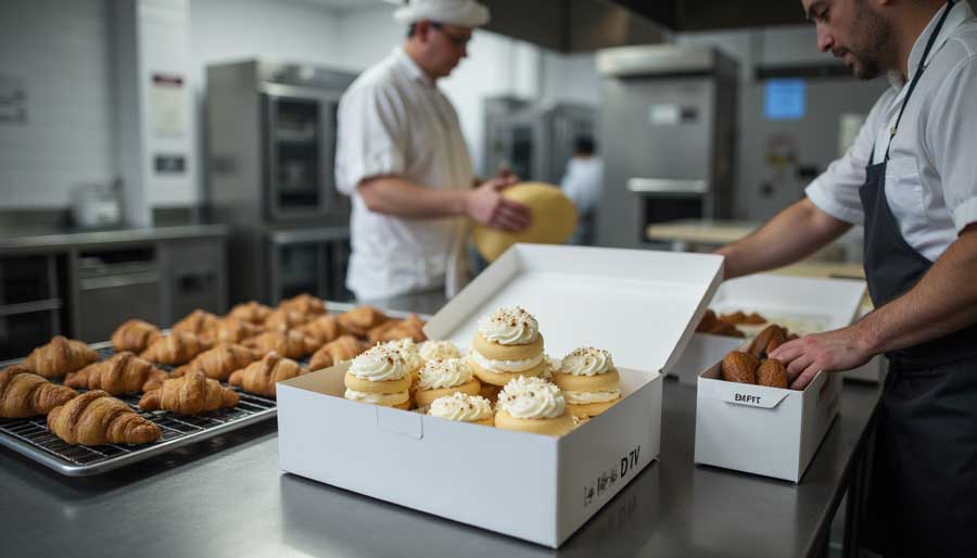 Climate affects delivery performance. Arizona bakeries can use paperboard for nearly everything. Florida operations need moisture resistant coatings or hybrid designs because humidity during delivery ruins unprotected paper. A paper tray inside keeps pastries separated while outer kraft provides structure and withstands handling abuse.