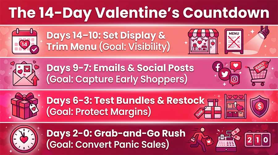 Valentine's Day is short, intense, and profitable if you set it up right. The 14-day countdown gives you enough lead time to prepare without burning out, enough flexibility to adapt as you go, and enough structure to stay focused when the rush hits.