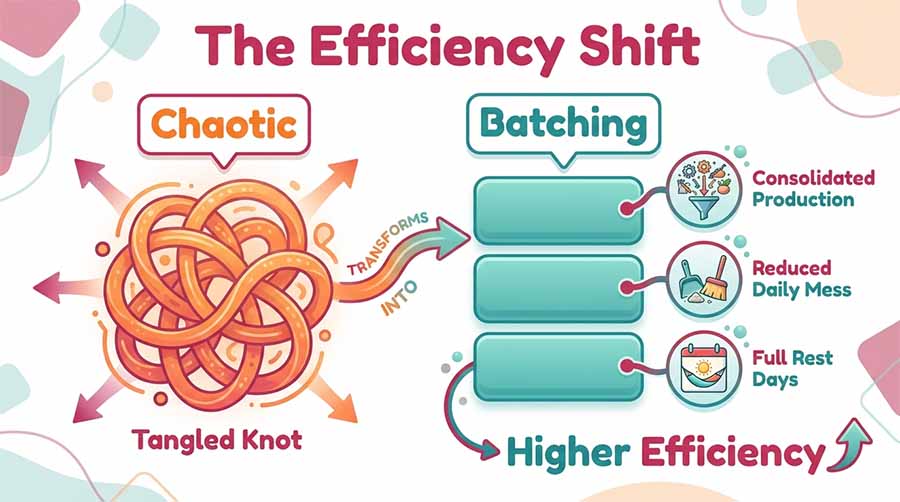 Cottage bakers who switched to this model reported something surprising: they actually produced more in three focused days than they had been making across seven chaotic ones. Batching reduces the daily mess, cuts down on oven warm-up waste, and frees up the mental space you need to plan ahead.