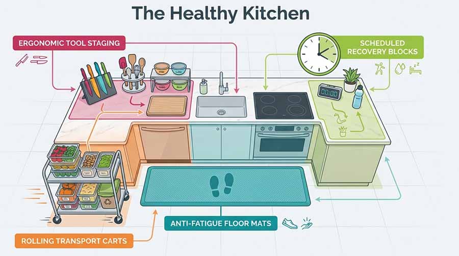 Keep frequently used tools and ingredients between knee and shoulder height to reduce repetitive bending and reaching. Use rolling carts instead of carrying heavy bowls across the kitchen. Install anti-fatigue mats if you're on concrete.