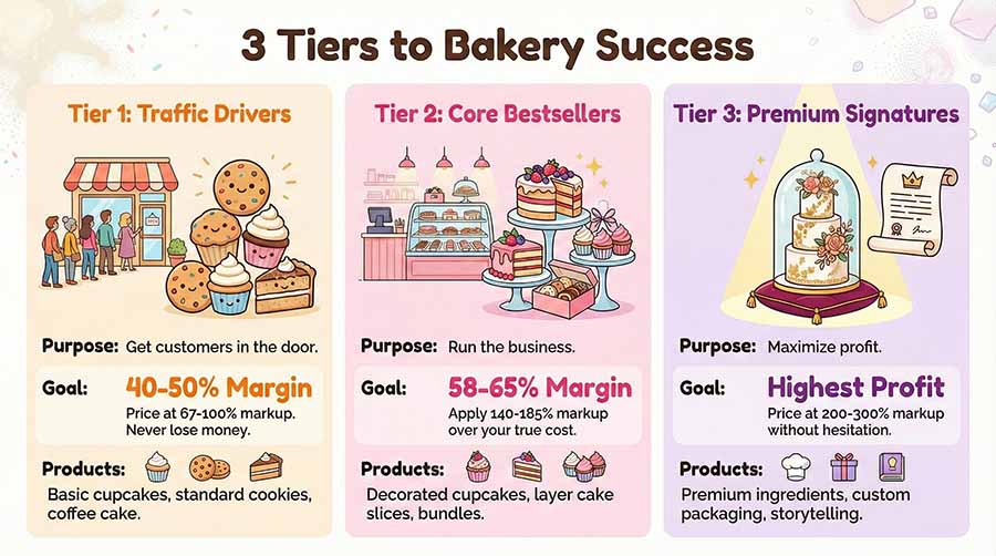 You can't absorb everything and survive. The solution: tiered pricing where entry items stay accessible, core products earn healthy margins, and elevated offerings justify top dollar through better ingredients and presentation that home bakers can't replicate.
