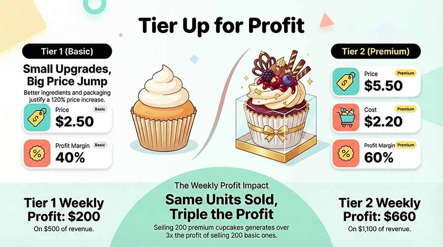 Typical scenario: A home baker introduced a signature chocolate cake with imported cocoa, salted caramel filling, and custom black box presentation. Her cost was $18 per cake. She priced it at $65. Within eight weeks, this single product represented 30% of her total revenue while accounting for just 15% of orders. That top tier positioning delivered triple the profit per unit compared to her standard cakes. (If you're running a home bakery, this premium focus strategy is even more critical since you can't compete on volume.)