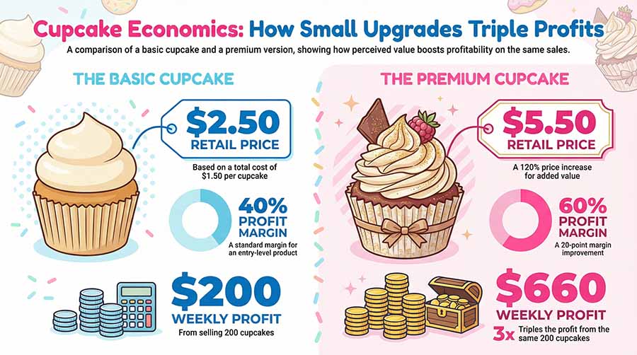 A decorated cupcake costing $2.10 to produce sells for $5 to $6. Smart bundling works here: Single cupcake at $5.50, or four for $20. You move volume, customers feel value, per unit costs drop slightly.