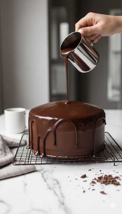 Pour the glaze over your chilled cake and tilt quickly to spread evenly. Return to the fridge until the glaze sets.