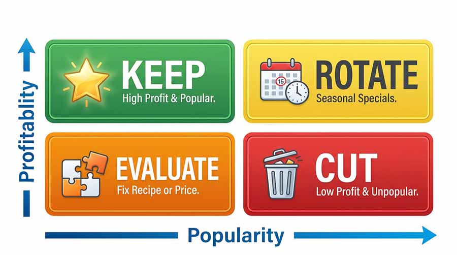 | Evaluate (Plow Horses) | High popularity + Low profit | Keep for traffic. Look for cost reduction or slight price increase. |
