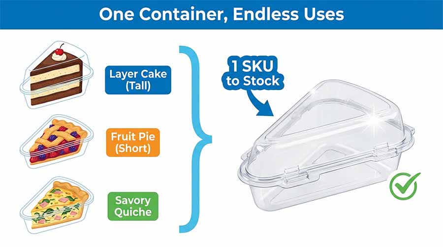 Examples: a universal slice container works for cake, pie, and quiche. A standard cupcake dome covers muffins and single serve desserts. A hinged clamshell handles cookies, brownies, and bars. Fewer SKUs, better inventory control, cleaner operations.