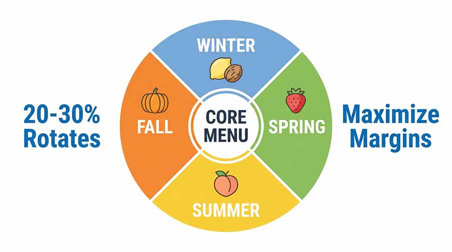 Build a rotation calendar. Your core menu should represent 60 to 70% of your offerings, staying consistent so customers know what to expect. The remaining 20 to 30% can shift quarterly, bringing in seasonal ingredients when they're cheap and fresh.