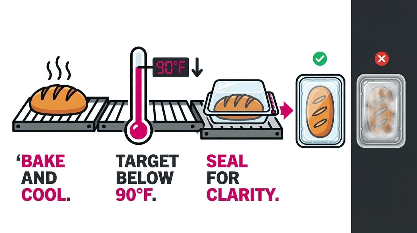 Direct Answer: Condensation forms when warm product meets a cooler container. Cool baked items below 90°F before sealing to prevent fog and extend shelf life.