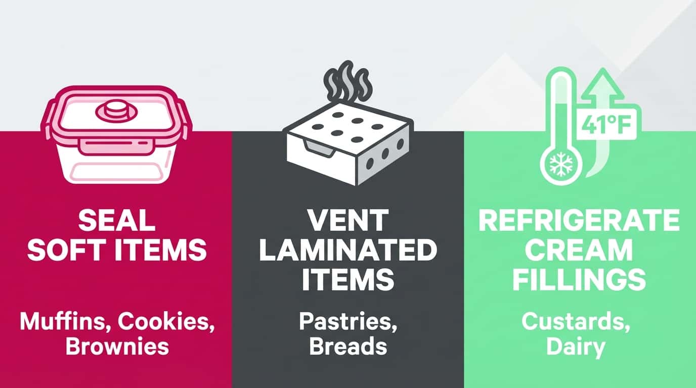 Direct Answer: Seal soft items like muffins and cookies airtight. Use breathable packaging for croissants. Refrigerate cream-filled pastries at 41°F or below.