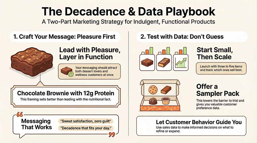 Don't lead with nutrition facts. Lead with flavor, then mention protein as a bonus. "Chocolate brownie with 12g protein" sells better than "12g protein chocolate brownie."