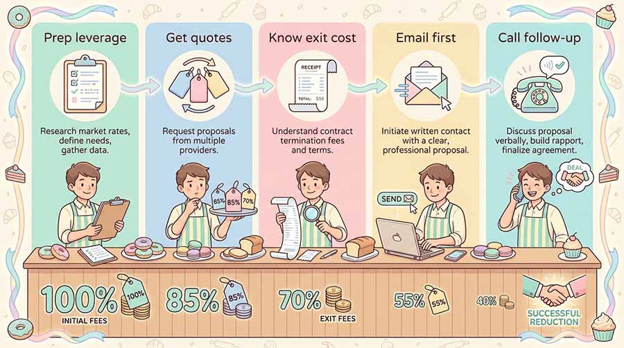Before you threaten to leave, know what leaving actually costs. Check your current contract for early termination fees. Some processors charge $200 to $500 to cancel early. Others have no penalty.