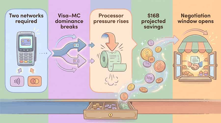 The Credit Card Competition Act was reintroduced in Congress on January 13, 2026. This bill requires banks with over $100 billion in assets to enable at least two unaffiliated payment networks on every credit card, breaking the Visa-Mastercard stranglehold that controls roughly 80% of the US market.