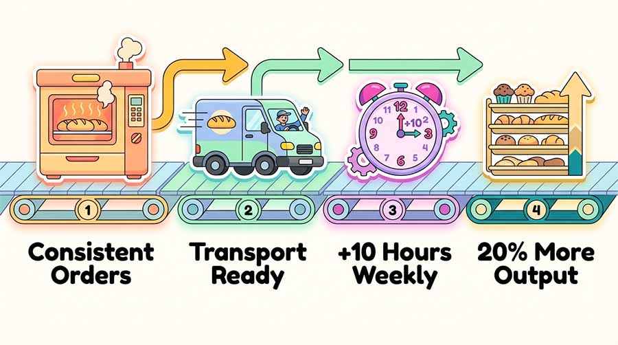 Your bakery is ready when you can fulfill current orders consistently, have reliable transport, and can add 10 production hours weekly. If you're running behind on retail orders, catering will break your workflow before it builds revenue.