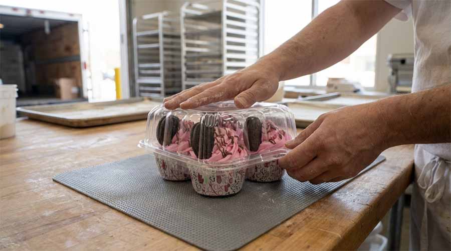 Sheet cakes need boxes with 2 inches clearance. Cupcakes require inserts. Multi-tiered cakes require internal dowels and sturdy baseboards. Non-slip mats are non-negotiable. A $3 mat prevents hundreds in ruined product. Buttercream melts at 75°F. Run AC even in spring and use ice packs for summer.