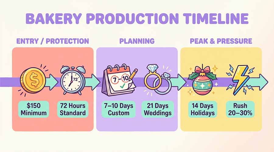 Set a $150 order minimum for delivery and require 72 hours lead time for standard orders, with longer times for complex items. Wedding cakes need 21 days, holiday events need 14 days.