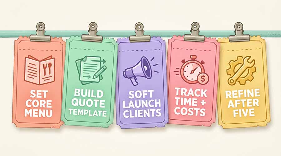- Order 1: Create a menu with 3 to 5 core items. Focus on products you already make well. Test packaging and transport first.