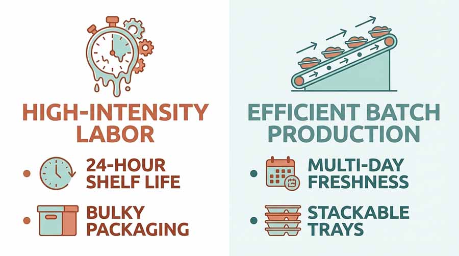A frosted cupcake has a narrow window. By day two, buttercream dries, fillings weep, and texture drops. That means anything you do not sell today goes in the bin tomorrow. Compare that to a batch of cookies or blondies that stay fresh for days. Short shelf life and freshness logistics are flagged as a core restraint across the North American bakery market, and cupcakes feel the pressure hardest.