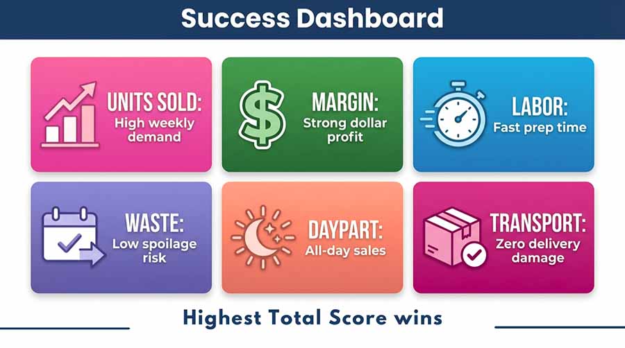 | Waste Risk | Shelf life, end-of-day write-off rate | Low waste, long shelf life or freezable |