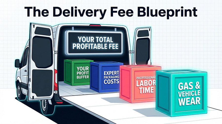 Pricing delivery is not complicated once you know every cost involved. The problem is that most resources skip the hard parts: round-trip mileage, packaging, and the value of your time as a skilled professional. They hand you a vague "charge a dollar per mile" and leave you quietly absorbing the rest. This article gives you the real formula, with actual numbers, three fee models to choose from, and the math that makes delivery a profit center instead of a charity service.
