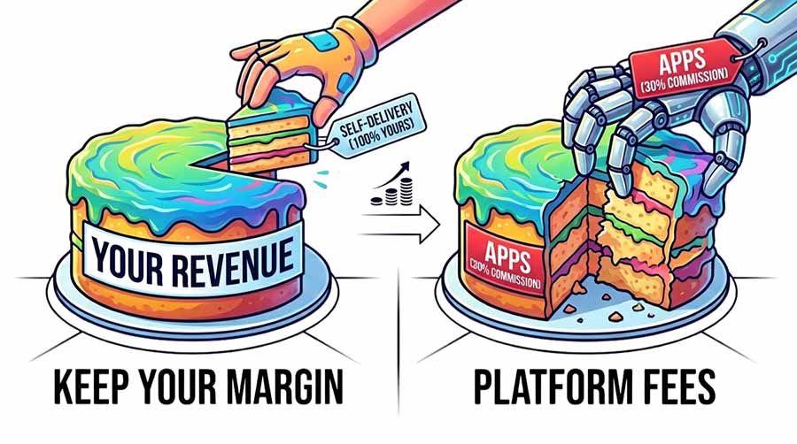 On a $100 order, the math nearly always favors self-delivery for an established local bakery. Platforms make sense when you need new customer discovery or cannot staff delivery yourself. The trade-off goes beyond commission rates: marketplace orders give you very limited customer contact information, while direct orders let you own the relationship, the email address, and the full order history.