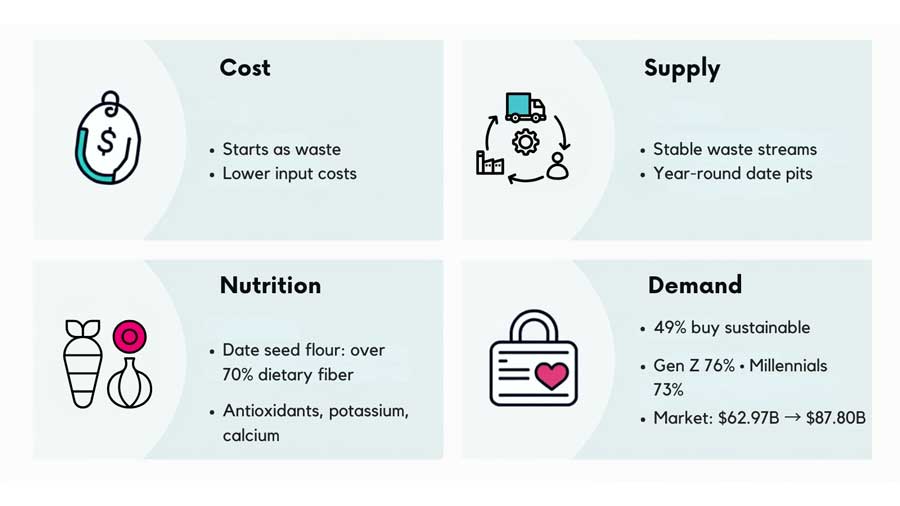 Nutritional Enhancement: Many upcycled ingredients exceed traditional options nutritionally. Date seed flour's fiber content surpasses most conventional flours, appealing to health-conscious consumers.