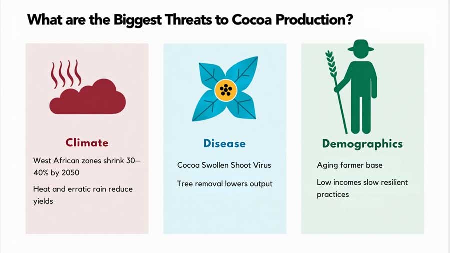 Climate change, crop diseases, and demographic shifts pose the primary threats to cocoa production, with West African growing regions expected to shrink 30-40% by 2050 due to rising temperatures and changing rainfall patterns.