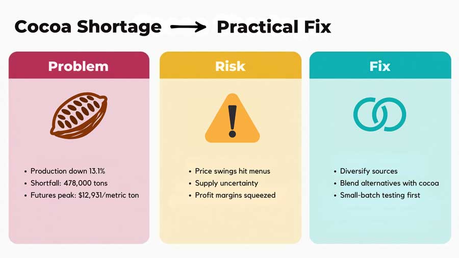 The numbers paint a clear picture. Global cocoa production dropped 13.1% in 2023-24, creating a 478,000-ton shortage. When futures prices hit $12,931 per metric ton in late 2024, relying solely on traditional cocoa became a serious business risk.