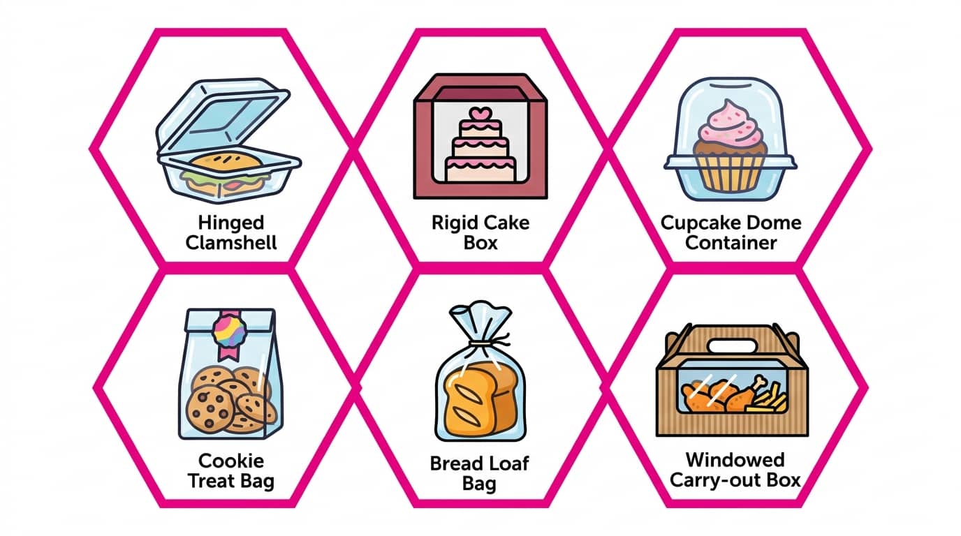 Direct Answer: Six formats cover most bakeries: hinged clamshells, rigid boxes, cupcake containers, treat bags, bread bags, and windowed carry-out boxes.