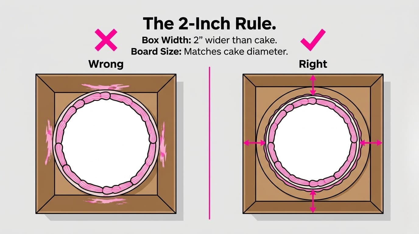 This is the 2-inch wider rule, and it applies across every round cake size. The extra inch on each side gives the frosting clearance, prevents the cake from shifting during transport, and leaves enough room for a cake board to sit flat without the corners catching the box walls.